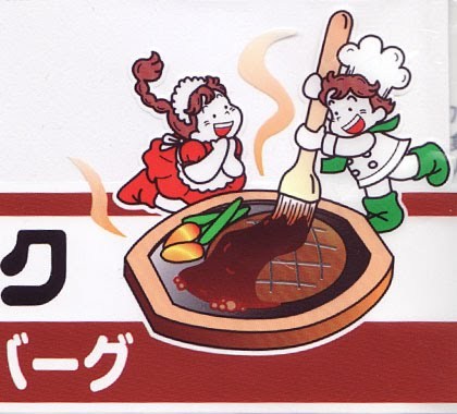 こちらは「てりやきハンバーグ」のイラスト。てりやきなのできちんとタレを塗りながら焼いています。洋食シリーズは2人ともシェフとウェイトレスの服装をすることが多いんですが、これに関しては面白い例があるので是非、同じく発売中の「鹿児島県産黒豚メンチカツ」を見てみましょう。