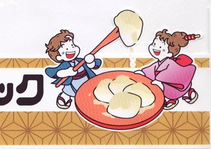 こちらは「きなこもち」。和風の帯背景に和服できなこもちを豪快に刺し上げる男の子。ぽそぽそと落ちるきなこのパウダー感がありありと描かれ、お茶菓子向きな器の「皿っていうか板っていうか」という雰囲気まで和風に揃えられたナイスイラストです。