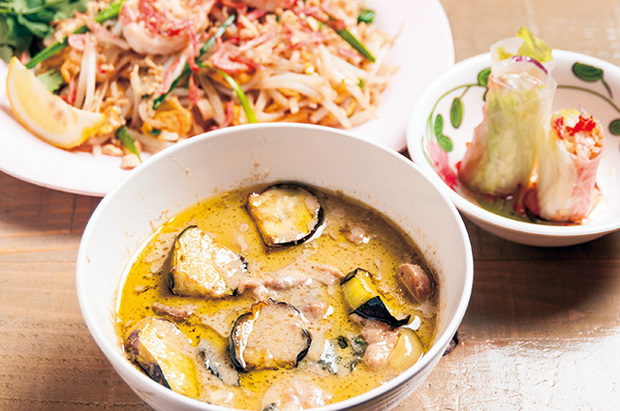 タイの屋台料理を、屋台街のような雰囲気の中で気軽に味わえる店。ランチは、「日替わりカレー」や「パッタイ」など8種のセットメニューがあり、どのセットを注文しても、グリーンカレーとライスは食べ放題なので、お得感たっぷり。ココナッツ多めのグリーンカレーは、野菜がたくさん。