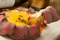厚い生地にたっぷりのチーズと具材を詰め込んだ話題のシカゴピザに、ローストビーフをはみ出るほど使用した贅沢な「肉シカゴピザ」。