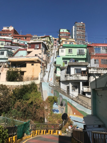 ホチョンマウルには、ドラマのロケ地以外にも見どころがたくさん! ホチョン=虎川と書くだけあって、「虎がのっそり歩く道」と名付けられた散歩道のほか、180段もある階段は、釜山駅近くにある草梁(チョリャン)イバグキルの168段よりも長く、下から見上げるとよく分かるアートが施されていて、少し距離を置いた場所から見ても楽しいです。