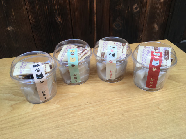 通常ひし形にカットされているくず餅が、猫のかたちにカットされている限定商品「ねこカップくず餅」は、透明なカップの側面から2匹の猫が姿を覗かせる一品。猫好きにはたまらない仕上がりとなっています。