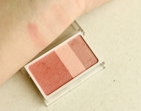 一番右のカラーはパール入りのピンクモカといった色合いで、この色がまた素敵です。頰の一番高いところに薄めに乗せると、横から見た時、顔の動きに合わせて、キラッとピンクの輝きが出てキレイです。