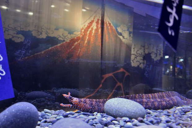 トラウツボの水槽を覗き込むと、ある事に気がつきます。トラウツボを引き立てるように、葛飾北斎の赤富士の絵画がパノラマのように広がるのです。