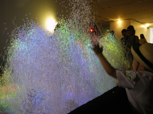 白く小さなビーズの中を動き回る光に参加者がスポンジの弾を投げ当てると、空中に彩り豊かな光の粒が高く舞い上がる。