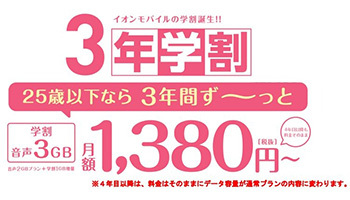 イオンリテールが提供するMVNOサービス「イオンモバイル」は2月15日~5月7日の期間限定で、25歳以下のユーザーを対象にした学割キャンペーン「3年学割」を、全国のイオン、イオンスタイル、ゲオモバイルなど約240店舗で開始する。