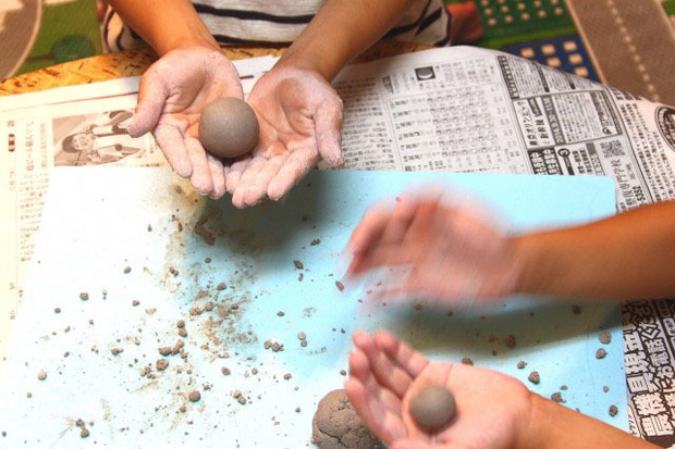 取り出した土をつぶすようにして練り、つくりたいだんごの大きさに取り分けます。