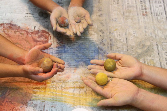 途中まで作り方は一緒で、さらこなを5回ほど繰り返しつけた後、最後に色こな(赤、青、黄色各10gずつ)をつけ、新聞紙や下敷きの上でピカピカになるまでコロコロ転がします。