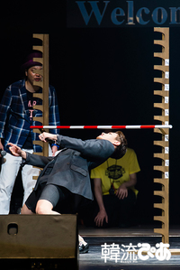結果は、ひとりだけ80センチをクリアしたユグォンがガッツポーズ。夜公演では、最速で失格になったジェヒョが、他のメンバーのくぐり方に異議を申し立てるも、ファンに退けられるなどの笑いもありつつ、ユグォン、パクキョン、ビボムがトリプル優勝した。
