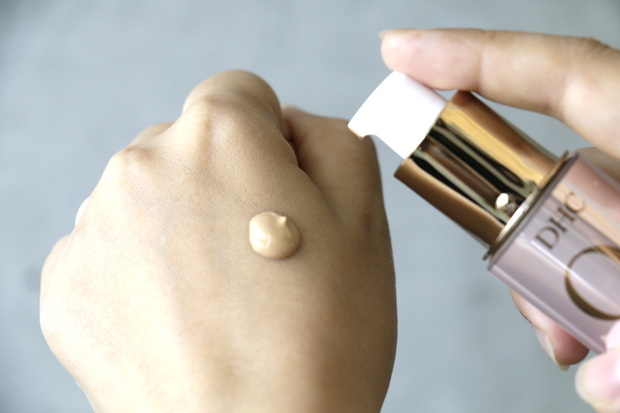 DHC「Q10モイスチュアケア リキッドファンデーションEX」をワンプッシュ手に出した瞬間、さっそくその「とろみ」感に驚きました。