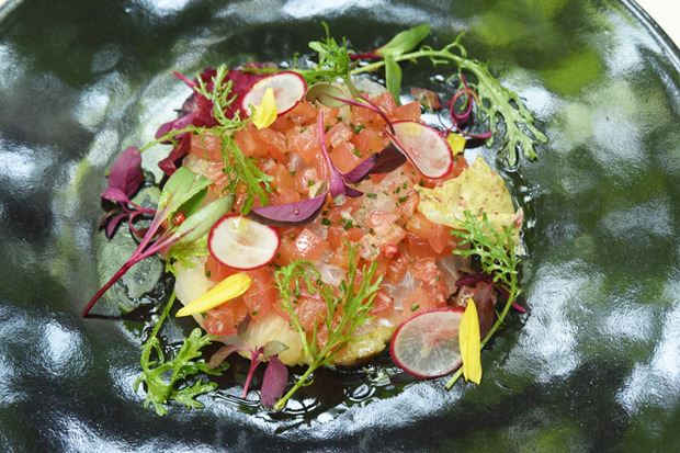 昆布締めした真鯛とヒスイ茄子のカルパッチョはトマトのソースがさっぱりして暑い夏にはぴったりな1品。