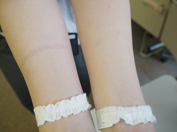 右がムーニー エアフィット、左が従来製品。45分間腕に付けた結果