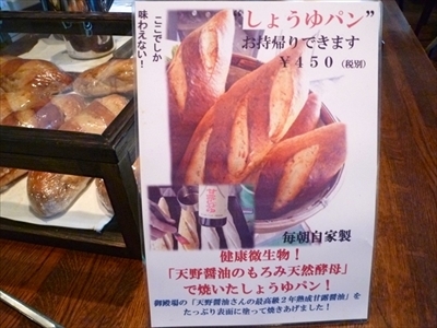 「醤油パン」は、天然酵母の含まれる醤油のもろみをパン生地に使用し、さらに二度仕込みした「甘露しょうゆ」をパンの表面に塗って焼き上げられる。