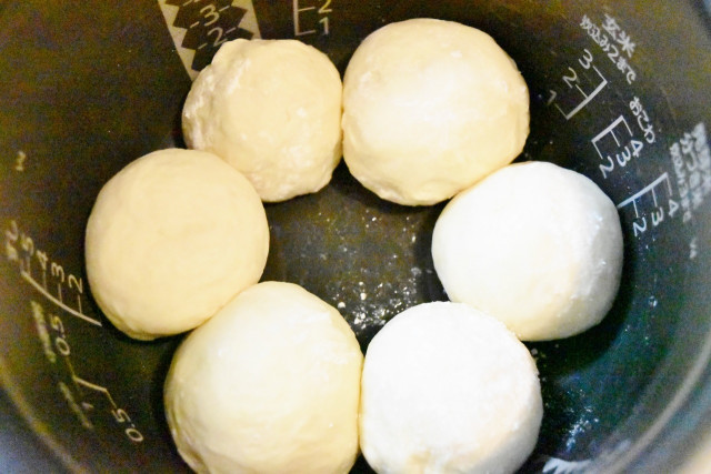 3:丸めた生地を炊飯器に入れて、炊飯のスイッチを押します。