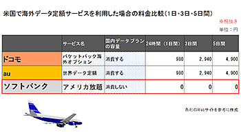 また、大きな違いとして、ドコモの「パケットパック海外オプション」、auの「世界データ定額」は、日本で加入しているデータ通信プランの容量から、海外で使った分を差し引く仕組みのため、海外滞在中、通常より多くの容量を消費すると、帰国後、容量が足りなくなる可能性がある。対して、ソフトバンクの「アメリカ放題」は契約プランと連動していないので、海外で使いすぎても容量不足に陥る心配は不要だ。