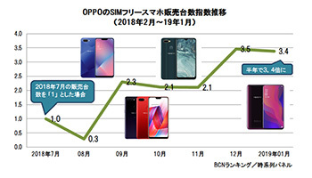 国内のSIMフリースマートフォン(スマホ)市場に2018年2月に参入したOPPO。当時、日本での知名度はそこまで高くなかったが、この数カ月でその状況は大きく変わりつつある。全国の家電量販店やECショップのPOSデータを集計する「BCNランキング」によると、19年1月の同市場における販売台数は半年前(19年7月)の約3.4倍。成長率で競合各社を抑え、No.1の伸びを記録した。全国の家電量販店やECショップのPOSデータを集計する「BCNランキング」によると、メーカー別シェアにおいても、ファーウェイ、ASUS、シャープの三強に次ぐ4位にまで順位を上げている。