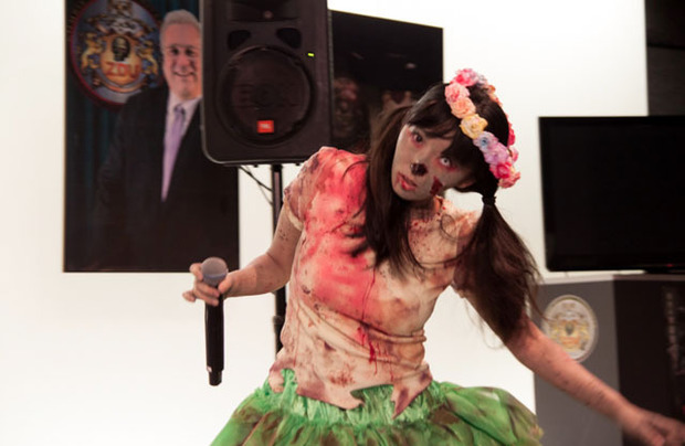 原宿ギャルゾンビことゾンビアイドル、小明さん登場。最近、フランス人男性と電撃結婚して、ママになったばかりとか。こんな幸せそうなゾンビを見るのは初めてです。