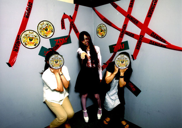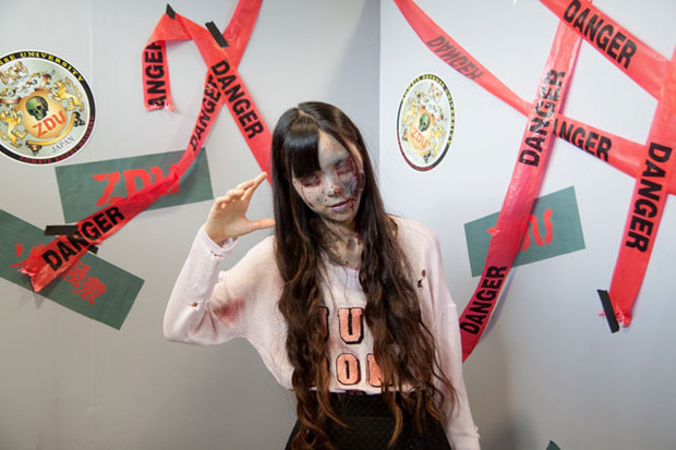 ゾンビ屋敷の入り口付近にある写真スタジオでは、かわいい原宿ギャルゾンビと一緒に写真撮影できます。今回、初めてゾンビになったというギャルゾンビさん。鏡で自分の顔を見るのが怖かったそうです。ポージングの練習をしながら待機しておりました。研究熱心なゾンビです。