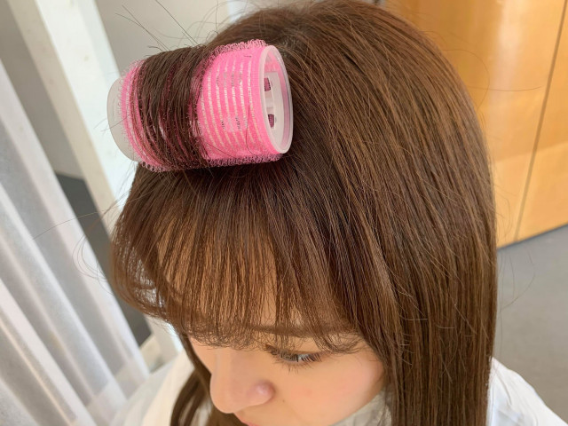 やり方は、前髪の1番高い部分の三角形ゾーンを、マジックカーラーを使って根本から巻くだけです。