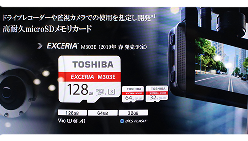 2月28日~3月3日にパシフィコ横浜で開催された「CP+2019」では、東芝メモリが春に発売する予定の「EXCERIA 高耐久microSDHC/microSDXC UHS-1 メモリカード(M303E)」を参考展示していた。東芝メモリ営業本部 販売推進統括部 販売推進第四部 販売推進第七担当 入江健介主務は、「GW前の発売を目指す」という。