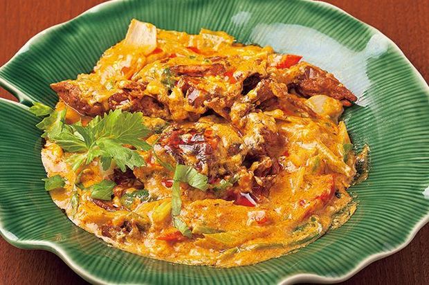 ソフトシェルクラブや野菜をココナッツカレーで炒め、卵でとじたマイルドな味わい。