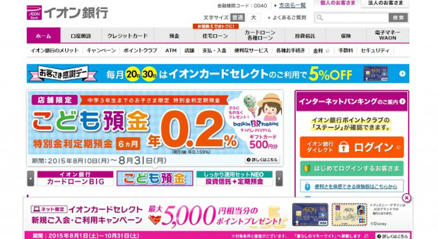 イオン銀行のATMなら365日24時間ATM手数料が0円。全国に5,000台以上設置されていて、土日も休日も夜間(店舗の営業時間内に利用可)も時間を気にしなくてよいのが便利。今までもゴールデンウィークや冬休みにこども預金(※すでに総合口座を開設している人対象の定期預金)口座開設キャンペーンが行われており、現在も2015年8月31日までこども預金キャンペーンが行われています。