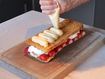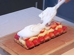 そして、パイ生地の上に「ディプロマットクリーム」をぬり、苺と「クレーム・シャンティー」を重ねる。この工程を繰り返します。