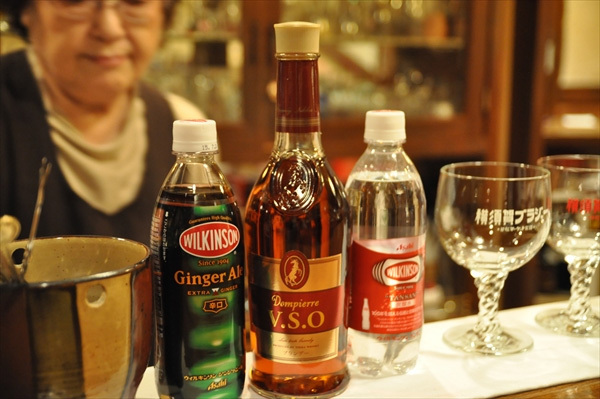 ニッカのVSOP、ウィルキンソンのジンジャーエール(しかもペットボトルのもの!)と炭酸が「横須賀ブラジャー」の基本材料。グラスもオリジナルだ。
