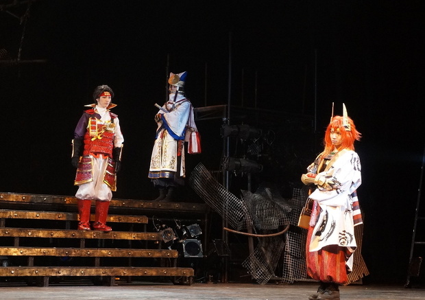 また、この舞台では武器を使ったアクション以外にもワイヤーアクションも見所の一つ。襲いかかってくる敵をヒラリとかわす、華麗な舞に驚くこと間違い無しです。テキパキとワイヤーがつけられ、空を飛ぶ演出が終わるとすぐ“地上”へのアクションに戻る素早さにも感動です。