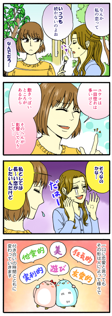 一口に“恋愛”と言っても、ゲームを楽しむような遊びの恋愛や、自分を犠牲にしてまで相手に尽くす恋愛、友情のような恋愛など、人によって様々ですよね。