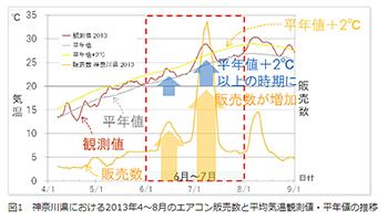 気象庁と大手家電流通協会は過去に、気温と季節家電の販売台数の関係性を明らかにするための実証実験を行った。エアコンでは、神奈川県で2013年4~8月のエアコン販売台数と7日間を平均した観測値、平年値のグラフを付け合わせた。すると、7月に平年値より2℃上昇すると、エアコンの販売台数が約1.5倍に増加することが分かった。