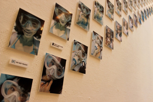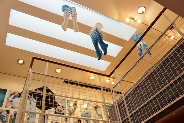 二階フロアも壁一面に作品が展示されています。ニーソがプカプカ浮かんでいるようにも見えますね。