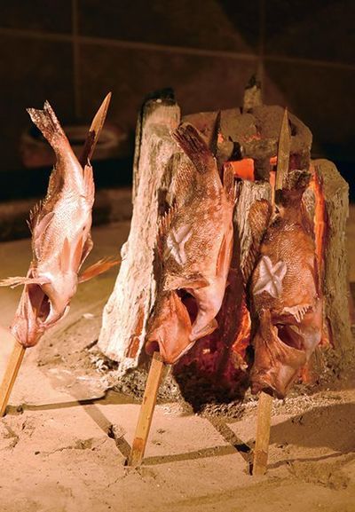 春はメバルやカサゴ、夏はアジやイサキといった旬の魚を使う塩焼きをベースにしたメニューが中心で、素材の味をシンプルに楽しめる店。焼き物は串に刺した魚を炉端に立てて焼く炭火焼き。絶妙な火加減で焼き上げられた、ふっくらとした身と香ばしい皮が食欲をそそる。