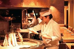 【表参道】七代目 寅 店内の中央で行われる炭火焼き。焼かれる様子が席からもよく見える。