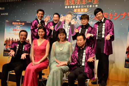 熱海五郎一座の新橋演舞場シリーズ第6弾「翔べないスペースマンと危険なシナリオ ~ギャグマゲドン mission~」が5月31日(金)から東京・新橋演舞場で上演される。その製作発表が行われ、構成・演出・出演の三宅裕司と、出演者の渡辺正行、小倉久寛、春風亭昇太、東貴博、深沢邦之、今作のゲストの高島礼子と橋本マナミが登壇した。