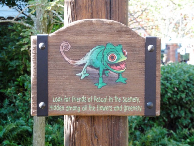 ラプンツェルのエリアにある看板。エリアの中には、パスカルの仲間たちが隠れている。