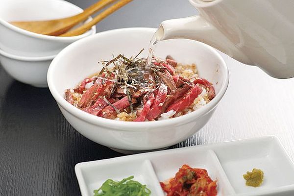 まずは丼、次は薬味と一緒にと、段階を踏んで味わえる。最後は牛スープでしめて
