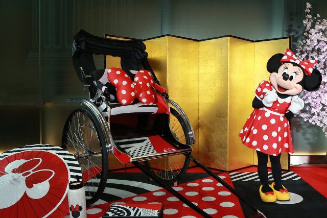 日本橋限定展示の人力車はミニーの可愛らしい装飾が施されたもの。