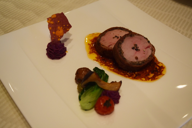 豚フィレ肉の香草包み焼き ヴァイオレットマスタードソース ミモレット風味のサツマイモチップと共に