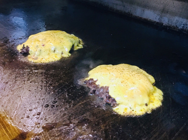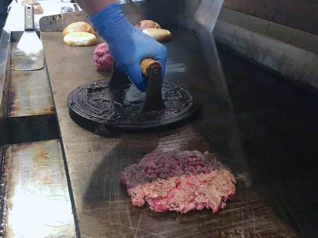パティは1枚120グラム。肉をそのまま鉄板に置き、スマッシュと呼ぶ道具でプレス。ヘラで形を整えたら、ひっくり返し、フタをして蒸し焼きにする。
