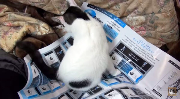 新品のバランスボールに興味津々の白黒猫さん。空気を入れよう、取説を開いたところ、「ここは私の出番に間違いない」とばかりに、占拠しております。
