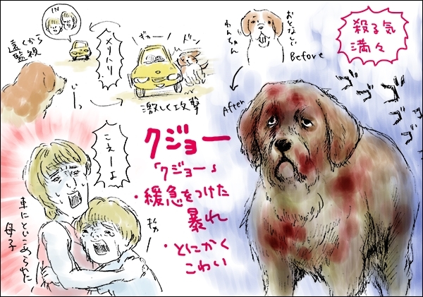 その迫力ある攻撃もさることながら、車に引っ込んだ親子を数日にわたって監視し続ける、ねばりと冷静さが一番怖い…世界一嫌な「待て」ができる犬、それがクジョ―…。