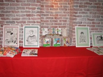 授賞式の舞台となったのはニッポン放送イマジンスタジオ。昨年は東日本大震災の影響で授賞式が行なわれなかった(オンラインでの発表のみ)ため、2年ぶり4度目の開催となる。まず会場前の通路にはノミネートされた全15作品の単行本・掲載誌が並び、ヒネリの効いたキャッチコピーとともに来場者を迎えてくれた。さらに通路の奥には歴代受賞作品の単行本と、作者本人による受賞記念イラストも展示。過去の受賞タイトルは『岳 みんなの山』『ちはやふる』『テルマエ・ロマエ』『3月のライオン』と非常に豪華な顔ぶれである。