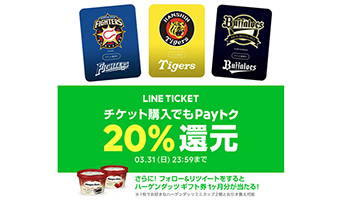 3月29日にプロ野球が開幕し、セ・パ両リーグの合計12チームが一斉にぺナントレースに突入する。3月31日まで実施しているスマートフォン(スマホ)決済サービスのLINE Payの「Payトク20%還元」キャンペーンは、2月からLINEチケットとも連動してるため、阪神タイガース、オリックス・バファローズ、北海道日本ハムファイターズのホームグランドで行われる試合のチケットをお得に購入することができる。