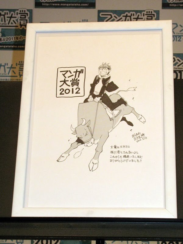 壇上に呼ばれた荒川氏は今回の受賞について「名誉ある賞をいただきありがとうございました。選んでくださった書店さん、支えてくださった出版の方々、仕事場のアシスタントさんたちや家族、取材先でお世話になった方、何よりも読んでくださった読者の皆さんに、心からお礼を申し上げます」と丁寧に述べた。実行委員から受賞者に贈られる手作りのプライズ(贈呈品)は今年も用意され、ヤマザキ氏から『銀の匙 Silver Spoon』担当編集者の坪内崇氏へと手渡された。写真上はそのときの様子、写真下は受賞記念に荒川氏が描き下ろしたイラストである。