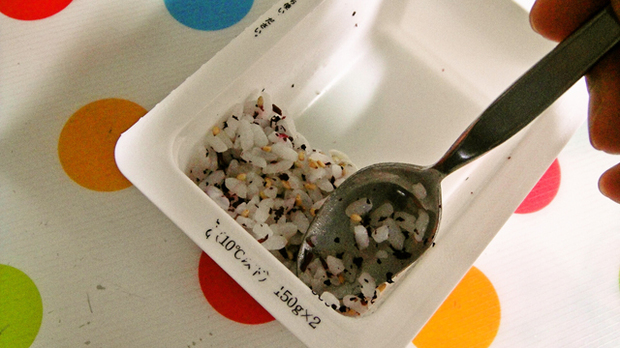 ごはんを適当な「型」(写真は“お豆腐”の空き容器)に入れ、スプーンでぎゅっぎゅっと押します。
