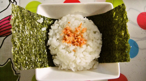 焼き海苔(おにぎり・おもち用)を敷き、その上にごはんをのせ、“溝”を作ります。