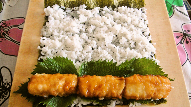 写真は、のり・ごはん・青じそ・チーズ、そして甘辛い天つゆタイプの味がついた「イカの天ぷら」(冷凍品/市販)を並べました。