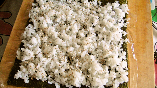 (ラップは巻き込まないようにしながら、ごはんを巻きます)