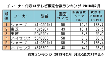 4K・8Kの実用放送「新4K8K衛星放送」が始まって4カ月。対応4Kチューナー付きのテレビの価格がだいぶ下がってきた。この2月で最も売れたのがシャープの「4T-C50AN1」で平均単価(税別、以下同)は13万9000円と15万円を切る。 販売台数ランキング2位から4位までの製品はさらに安く、いずれも10万円を軽々と下回っている。2月に販売された4Kチューナー付きテレビで最も安かったのがハイセンスの「43A6800」。43型でランキングは9位ながら、なんと5万8000円という安さだ。直販限定のためランキングには登場しないが、ピクセラは40型で4万円台半ばの製品を販売している。